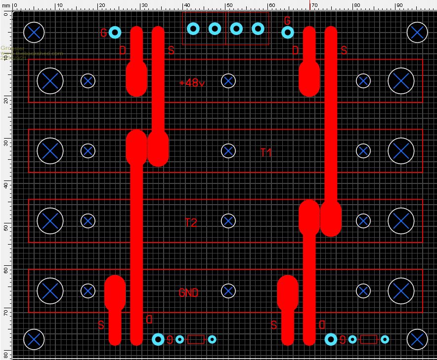 The power-board is currently in development, and there will also be a capacitor board with a bunch of 10,000uF 100v caps in parallel on the 48v rail - still a bit of work to do, but getting there. I will upload GIF's of the power board once I finish it. I have designed the power board, so that each one forms one H-bridge, and you can parallel up as many boards as you need to handle the toroid you are using. This allows me to easily add extra MOSFET power-board stages later to increase the capability of the inverter if I want. It also, again, keeps the PCB price right down by staying inside the 100x100 size limit. You can get ten 100x100 boards for about US$12, so that would allow you to build and use up to ten MOSFET power-boards(40 MOSFETS!) just by bolting extra ones on to the existing ones - all for twelve bucks worth of PCB. Here is a preliminary GIF so you can see how I am thinking: