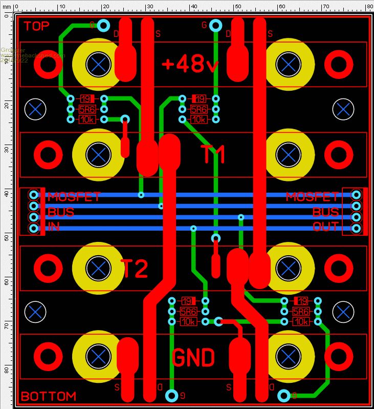 Don't see Vs1 and Vs2 in your bus... and B- would be good too. The 10k may be better replaced with 20k. Caps may be too far from the fets to do their job properly, the ftes may see a lot more ripple than they would have if the caps were placed as close as possible... we are switching a lot of amps........ and I just don't know about the stray inductance that will arise from this modular design. Not sure how many you can parallel before capacitance of the gates starts to overcome the signal and degrade it... you may need a stronger driver to keep control after 6 fets. You have introduced a lot of uncertainties all at once, so if it is unstable, it may be a handful to isolate the problems.... or it may just work fine...I have no idea really... certainly worth a try. Tests with the o/current seem to point towards success, hopefully I will have more concrete news sooner rather than later. .........oztules Village idiot...or... just another hack out of his depth |