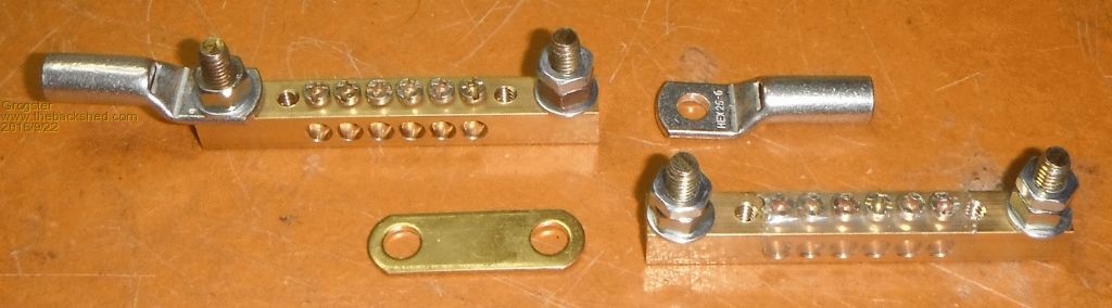 The bus-bars are now standard electrical bus-bars as used in meter-boxes and distribution systems. They are 10mm square brass, and come with studs and screws pre-fitted. Normally, these are used as neutral and earth bus-bars in the main distribution box for the house or where-ever.