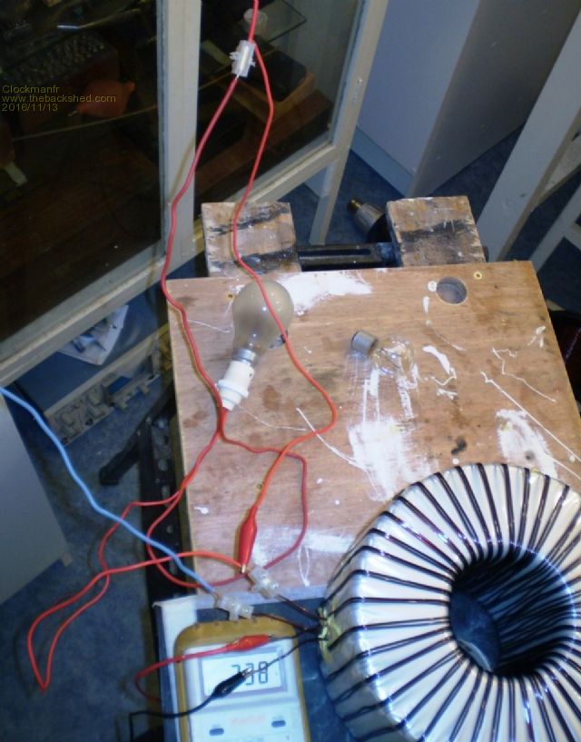 The Photo shows the 100w bulb that is now bypassed with that insulated croc clip, so the toroid first secondary winding is taking the full 238vac Mains, and inducing 238vac in the second secondary winding. And Yes, I will tidy up the windings before I resin coat them, but I always test first.