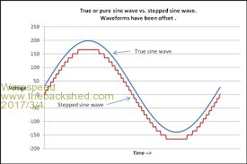 This is not the usual high frequency PWM type of sinewave inverter, but three individual low frequency square wave inverters with the outputs combined through transformers to produce a multi stepped output waveform. The output has 27 steps and looks like this compared to a true sinewave: