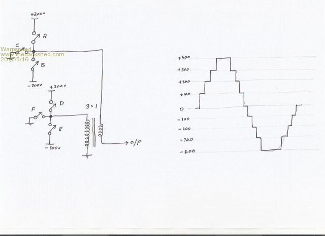 Now we build a second inverter, but this time with a voltage of only one third by using a 3:1 transformer to give us +100v, zero, or -100v.