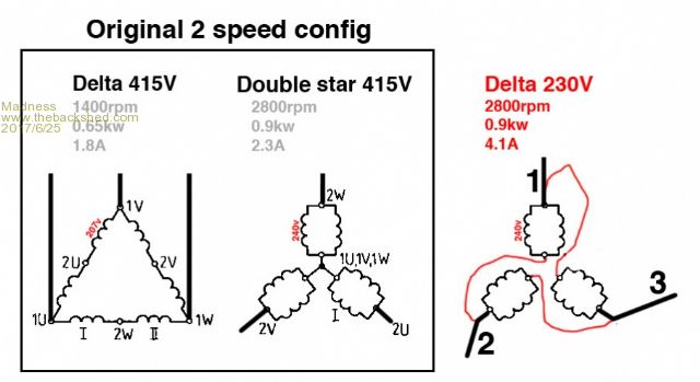 Still waiting for the VFD to arrive via Fastway was sent Wednesday tracking says still between Melbourne and Sunshine Coast. From past experience, Slowway might be a better name for them. ![]() All 3 motors are setup differently, first motor on the planer was dead simple to change to Delta. ![]() Next the saw motor took slightly longer to figure out, it simply has 6 wires coming out with 3 joined together, I separated them and just need to rewire them correctly for delta. ![]() Brown - Yellow = 1 winding Black - Green = 2nd winding Blue - White = 3rd winding. The 2 speed motor for the spindle moulder is a bit more involved, from what I can figure out it is a Dahlander configuration like this. ![]() There is no simple external way to change it to 240V Delta from what I have found. It needs to have each of the Delta windings legs changed from series to parallel, as per this diagram. ![]() These are the connections of my motor 6.8 ohms on each winding, it seems odd that the W2 and U2 seem to be swapped around. ![]() This is the resistances I get between terminals U - U2 6.8 U - V2 6.8 U - W2 12.2 V - V2 12.2 V - W2 6.8 V - U2 6.8 W - W2 6.8 W - U2 12.2 W - V2 6.8 Next step is to get the motor out and disassembled to see if I can perform the required surgery on it. Changing it to 240 Delta will eliminate it's 2 speed capability which is no problem as the VFD will provide variable speed. There are only 10 types of people in the world: those who understand binary, and those who don't. |