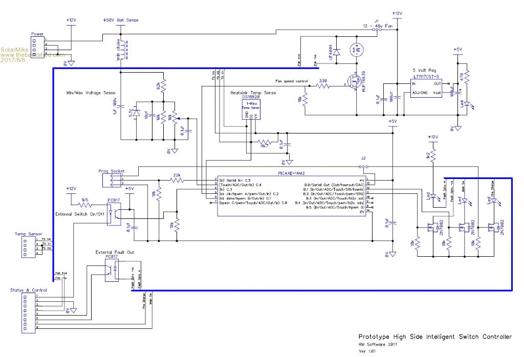 For the prototype, I have come up with a pcb layout for the high power components and a seperate pcb for the controller, note on the control schematic, connectors are miniture spring loaded board sockets, they do not plug into each other directly. As I have a quite a few picaxe chips lying around and they are simple to program, have used a picaxe 14M2 here for the cpu, this gives me another pcb with generic functionality that can be re-used elsewhere.