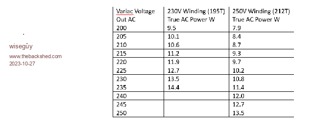 If instead of removing 17T from the 250V winding you added 17T to each 230V winding and paralleled up all the 250V windings but ran the output voltage at 230V from the 250V windings, driven from a 9T primary, idling is a bit better at ~ 16.5W for each toroid or 49W for the 3 toroids.