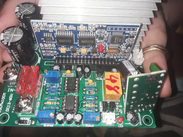 Time to figure out what parts I need to upgrade it to make it Bulletproof So i get practice before I get my big board This little board has a EGS002 it also has four iRFp 2907 Z mosfets it is supposed to B good up to 1800 watts it has two little 470uf 100 volt capacitors 2 soldered in car type fuses 40 amps each 4 trim pots 2 LM 358 chips it came with a separate dark red or maroon hard plastic filter capacitor the number on it is MPP 335 k 2 f. Co223212f I have a extra ESG 0 0 2 and the little LCd screen also be warned i am good parrot but Dumber than a box of rocks |