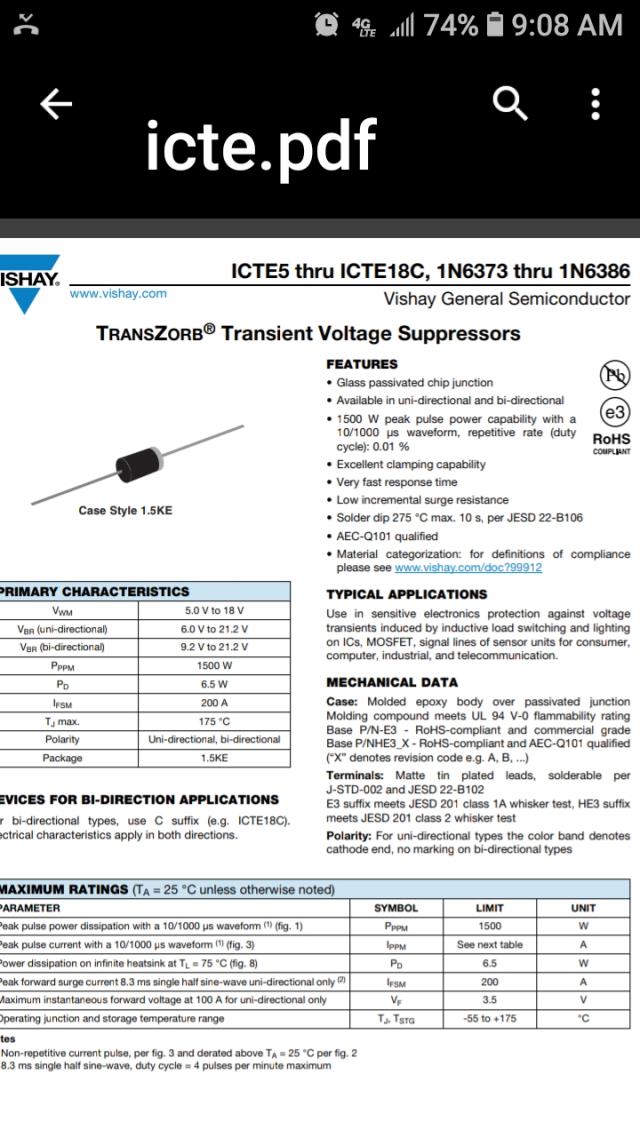 RS part no. 815-2578 Vishay ICTE15-E3/54, Uni-Directional TVS Diode, 1500W, 2-Pin 1.5KE AUD $0.92 each in a pack of 10