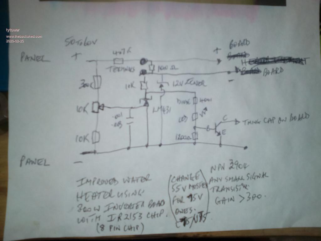 My batteries are full in a couple of hours each day so I'm looking at putting that excess capacity to work. That's what I was hoping to do here but as you say it seems designed to be confusing because each word he utters is carefully correct but blowed if you can read the circuit diagrams or his pics of the wiring . Here's my circuit I have built .
