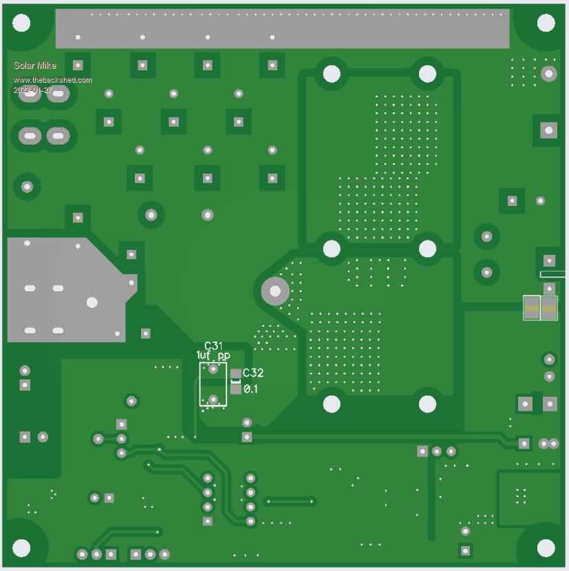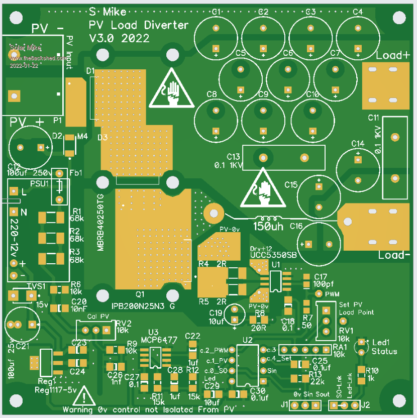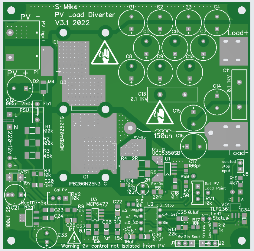 My unloaded PV voltages are 200V and mppt is 155V, so the devices are rated at 250V along with the 100uf 250V caps, the inductor 150uH powdered iron ring core sits on top of the caps. 10 - 15 amps output should be ok, limited by the ripple rating of the input caps, thats why I have used 10 of them for better heat dissipation rather than bigger 35mm can types. Having 4 PV arrays and controllers means I need 4 of these diverters.