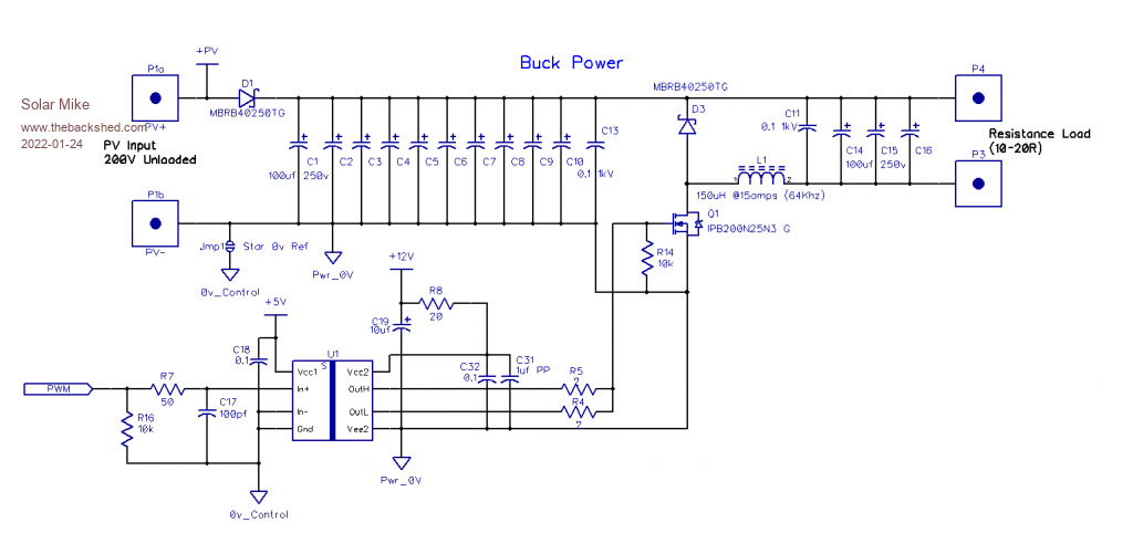 The buck converter has been implemented as LOW-side driver, using PV-ve as the 0v reference, so is linked directly to the PV making it somewhat hazardous for the unwary and requiring an isolated scope to do waveform measurements. All my controller designs are PV-ve 0v common so will be ok, some commercial controllers are not and would definitely require isolated probes.