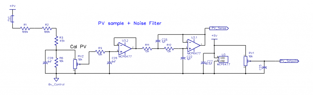 The PV input is full of switching noise, using a multi-stage active low pass filter to remove it, allows faster ADC measurements over using a single large RC combination.