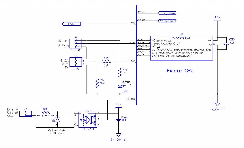 Minimal CPU control required, so have used a Picaxe 08M2, will play around with differing PWM frequencies, 32Khz has 1024 bit resolution, 64Khz 512bit etc; input voltage measurement about the set point isnt too critical, so will go with as high a PWM as I can get away with - (smaller Inductor).