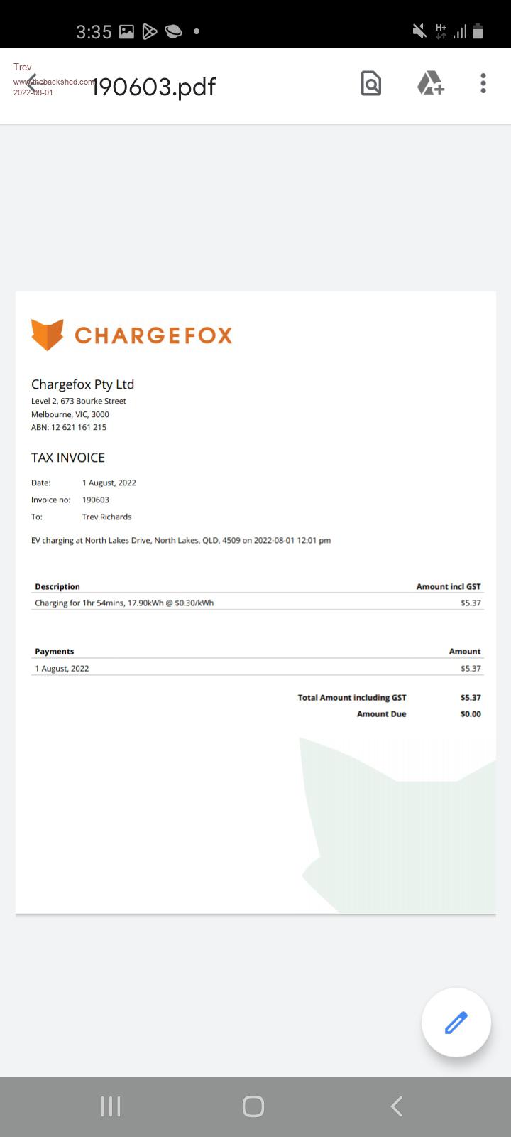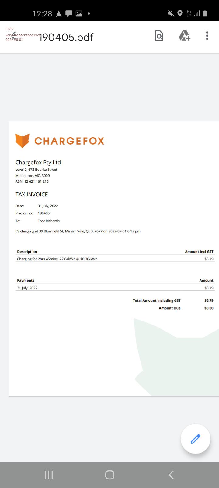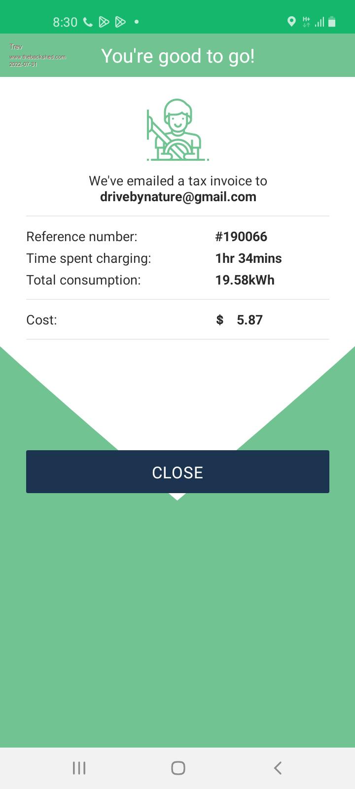 In a post above I had the chargefox screenshot of Childers but said it was Miriam (mistake). I lost the chargefox screen on my phone when trying to make the charger work at Miriam Vale. Here is a screenshot of the invoice they emailed  of Miriam Vale