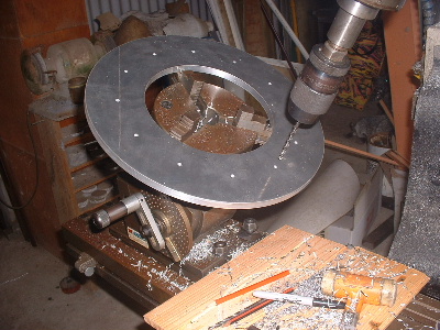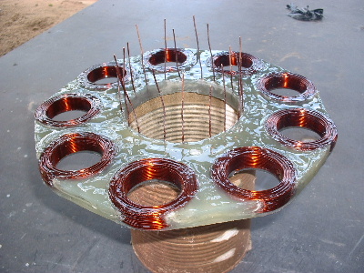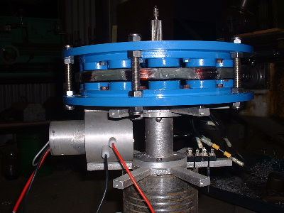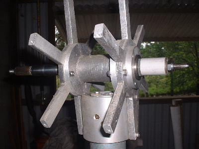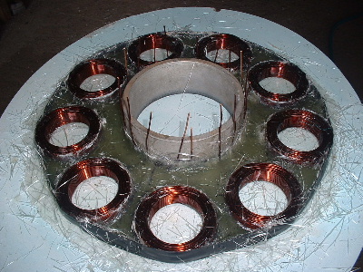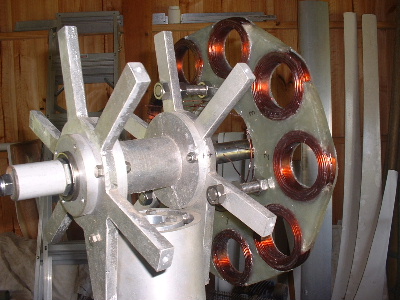 No worries Mac, you are allowed to get old. Good info though for somebody who don't know. Thanks Pete. I don't need to say any more. But sombody may want to know. The magnets are N50M, 50mm round x 12mm thick. Coils are 48mm ID and the OD is about 72-74mm. The coils have 100 turns of 1.25mm2 wire. Coils are equaly spaced as are the magnets equaly spaced. The centre of the magnets and coils is a diameter of 246mm. And yes,the 3:4 ratio is the critical bit. Temporary fit the stator to check where to run the wires out and then finish this off. Assembled the AXFX unit and discovered I did need the spacer I made after all, so pulled apart and put in the spacer and machined the front of the rotor hub so the blades would still go on. The jacking bolts are 200mm long and there was no significant magnetic pull at that distance apart. Any how here is a few pictures. Preliminary spin and yes voltage does occur. Details later after I test properly. Trev @ drivebynature.com |
