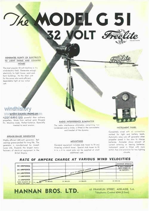 Hey Guys, I'm new to this forum, hope I can shed a light on Freelite stuff. I have a nearly complete G47 but never tried it out as I was told they were slow to start & were never a big seller. Aparently the D46 with a 32 volt gen. was more sucessfull if you had a good windy spot.It was my grandfather Les Hannan who developed the Freelite in the mid '20s & the G51 must have been one of the last models. When I was an apprentice in the early '70s I worked in what used to be the Freelite Dept. in Franklin st. Adelaide. There was still lots of Freelite stuff lying around including the generator test benches which still worked. I still have some of the original drawings & old tools. I'm now 60 & my father died about 5 years ago but he told me lots of stories about his early days at Hannan's & the times he spent at the Freelite test site out at Virginia. |