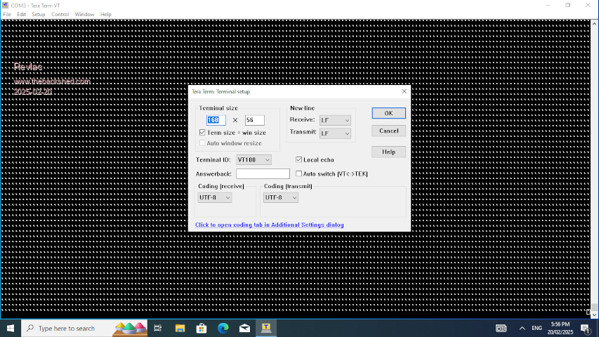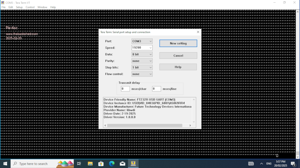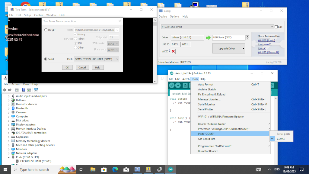 I got the Tera Term installed (on my widows pc) and running after a few attempts, now I see the com port is greyed out and not able to be selected, so went back to Arduino IDE to find its also greyed out, however it did have a little text at the lower right corner about the nano being plugged into com3 so it knows its there, I then tried another blank nano same thing happens, so checked drivers and no errors or problems, these are new nano's with that tiny micro USB port. I see the same problem question when searching the web. Think I have a bad cable so will need to find another, bit strange that it still works on the Linux computer with the Arduino IDE, the other nano with the larger usb port will still work on either computer and Tera term, also I plugged in the converter into the same nano then onto the pc and same result but it uses a different cable. Was going to make up another nano as a spare anyway. Might get some time later to try this. Apologies if some of that doesn't make sense. Cheers Aaron Off The Grid |