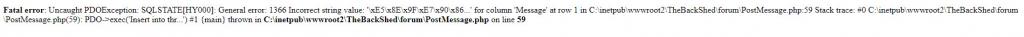Hi Glenn, just updating: ... made another try with the dutch message I sent you pasted to PM and received this: Fatal error: Uncaught PDOException: SQLSTATE[HY000]: General error: 1366 Incorrect string value: '\xE2\x80\x8B\xE2\x80\x8B...' for column 'Message' at row 1 in C:\inetpub\wwwroot2\TheBackShed\forum\SavePM.php:36 Stack trace: #0 C:\inetpub\wwwroot2\TheBackShed\forum\SavePM.php(36): PDO->exec('Insert into mes...') #1 {main} thrown in C:\inetpub\wwwroot2\TheBackShed\forum\SavePM.php on line 36 ... PS: This posting right here worked including Preview! Greez Andre Edited 2020-05-23 05:00 by Poppy Andre ... such a GURU?![]() | ||||