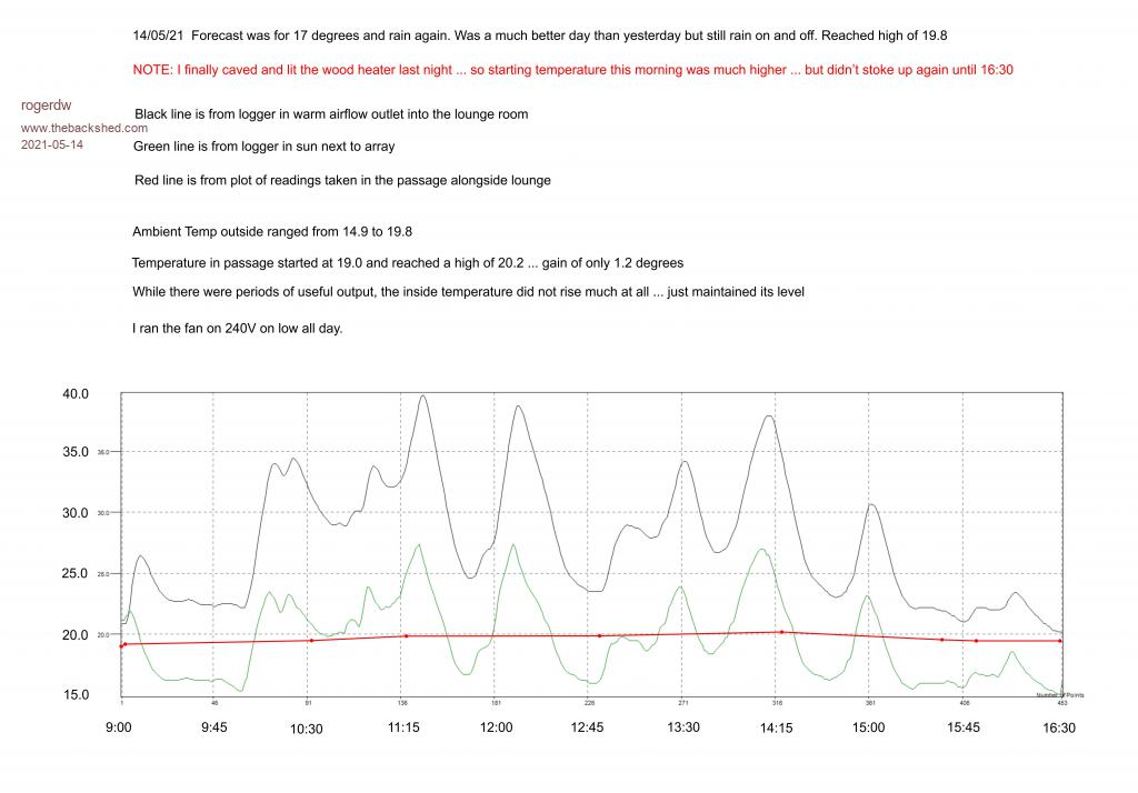 For us, the difference between getting up in the morning to 19 or 20 degrees instead of 14 or 15 is massive, though that improvement is because of the wood heater  ...  but it's great to see this air heater take over for the day and bring temperatures even higher  ...  especially knowing it's only costing the running of a 40-50 watt fan.
