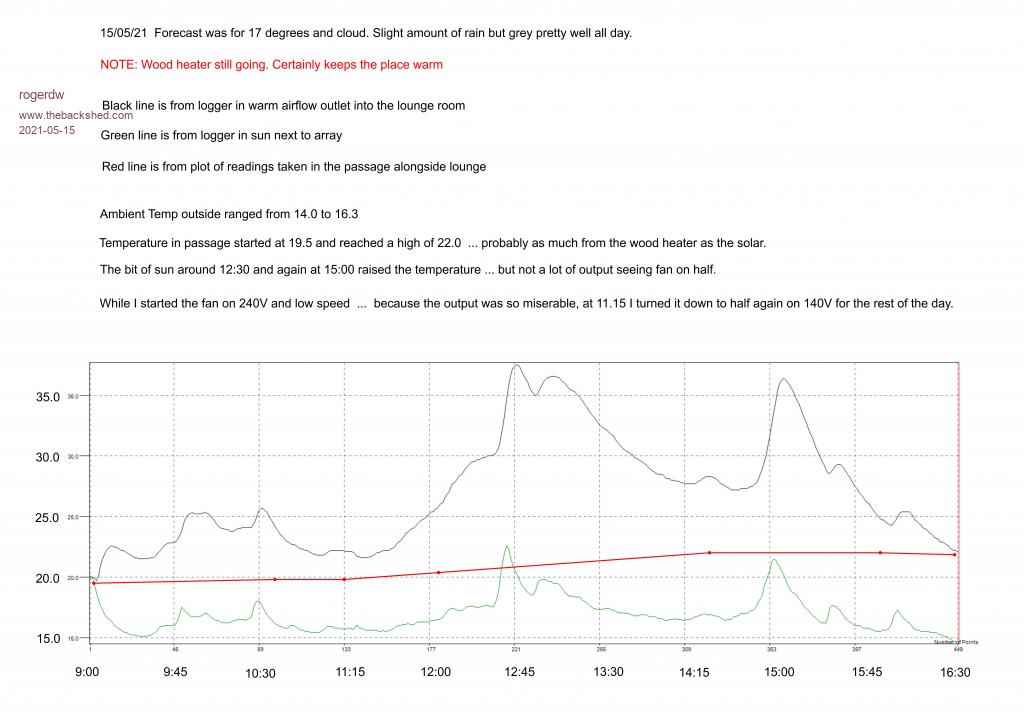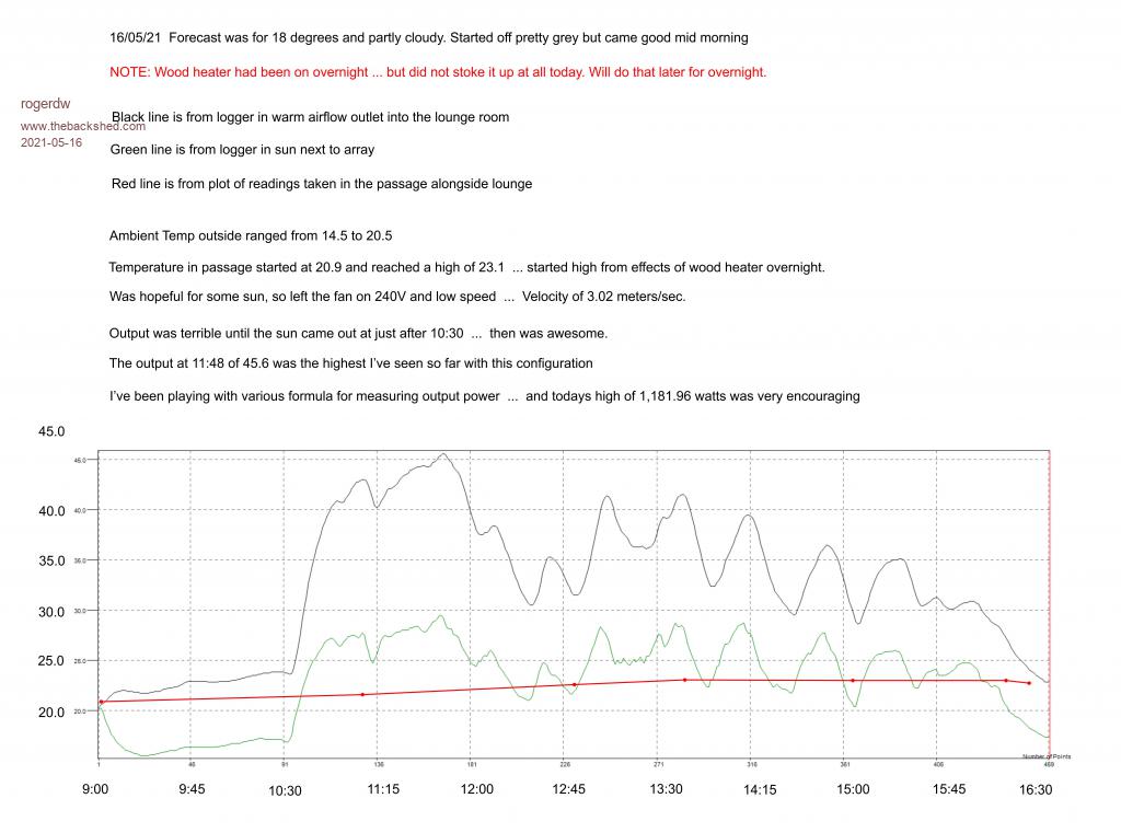 In the chart below you can see the result of the lower fan speed from about 11:30  ...  where there is a higher difference between the outside sun temperature and the output from the heater.