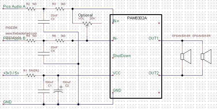 Hi Tom, The circuit is for the module, however the input circuit for the TDA2822 is an improvement so I'll update the PAM circuit if required. Perhaps you have the answer on the prototype already, put a header with +V / Audio A / Audio B / GND one side and Speaker + / Speaker - on the other with as much real estate in between as available, then make a module to fit with whatever audio design you feel like at the time. print "Good Luck" in the space provided The PAM8302 solution is probably the better way to go as the shutdown mode allows you to switch it off to save the batteries. (extra GPIO pin on header required) A 1k resistor in parallel with the 20k pot will do the trick for the volume control. Regards, Lyle. Edited 2023-04-05 22:12 by mozzie |