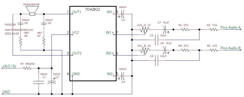 G'day Tom, Correct, only 1 x TDA2822 required but they have been obsolete in DIP package for a while from legit suppliers so its ALI etc and hope they work. There is also TDA2822D in SOIC still around if you can find them. This works with the PWM output from the Pico, no DAC required. This is the circuit I am using: Its a bit messy but that is the layout of the chip... Once again you can play around with different filters etc that others have designed, this was what I had at hand, also requires stereo volume control pot. Regards, Lyle. Edited 2023-04-05 21:40 by mozzie |