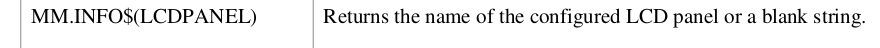 Works for me if the "$" is included (or if not included) -- but on standard, not VGA version. PicoMite MMBasic RP2350A V6.01.00b11 Copyright 2011-2025 Geoff Graham Copyright 2016-2025 Peter Mather > ? mm.info$(lcdpanel) ILI9488 > ~ Edited 2025-09-06 09:29 by lizby PicoMite, Armmite F4, SensorKits, MMBasic Hardware, Games, etc. on FOTS |
