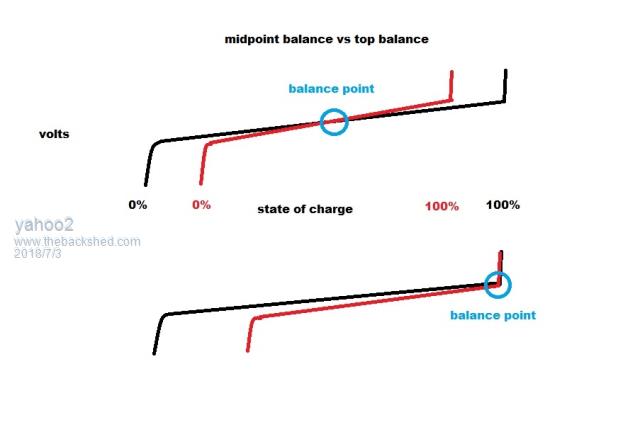 the red line is a cell with less capacity than the black line (rest of the cells). If I balance at a specific state of charge all the cells will be at that voltage EVERY CYCLE and the smallest cell will always hit full or empty before the others.