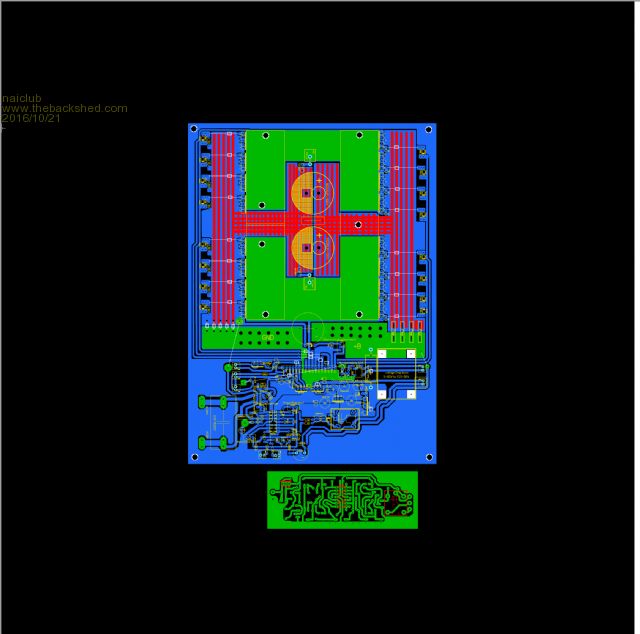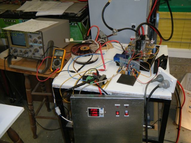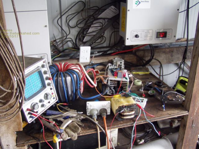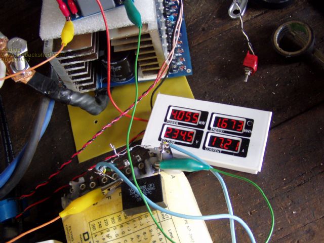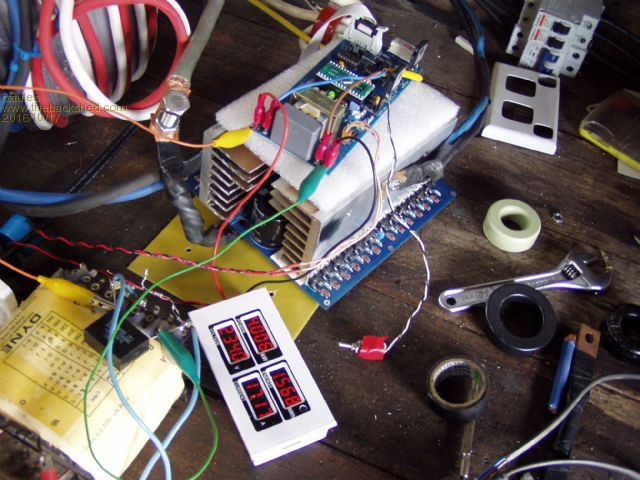 Here we are with a wide shot showing the carefully laid out inverter under test. It is using that board I showed earlier, with the controller I showed earlier ... somewhere here. Both PCB files are there to send straight to the chinese nanufacturers if you want.