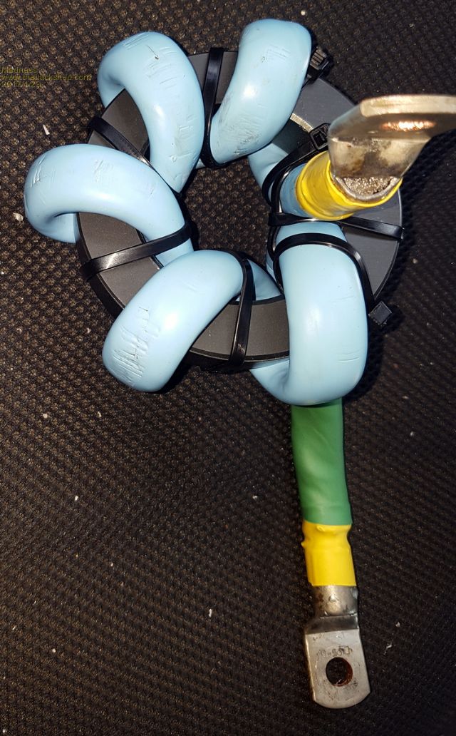 The 100mm x 65mm x 20mm Ferrite Ring with 6 turns of 95 square mm welding wire has worked well and gives me about 20% less idle current than the E type which is now >40 watts with the big double core toroid. It is quite a bit bigger than it appers in the photo.