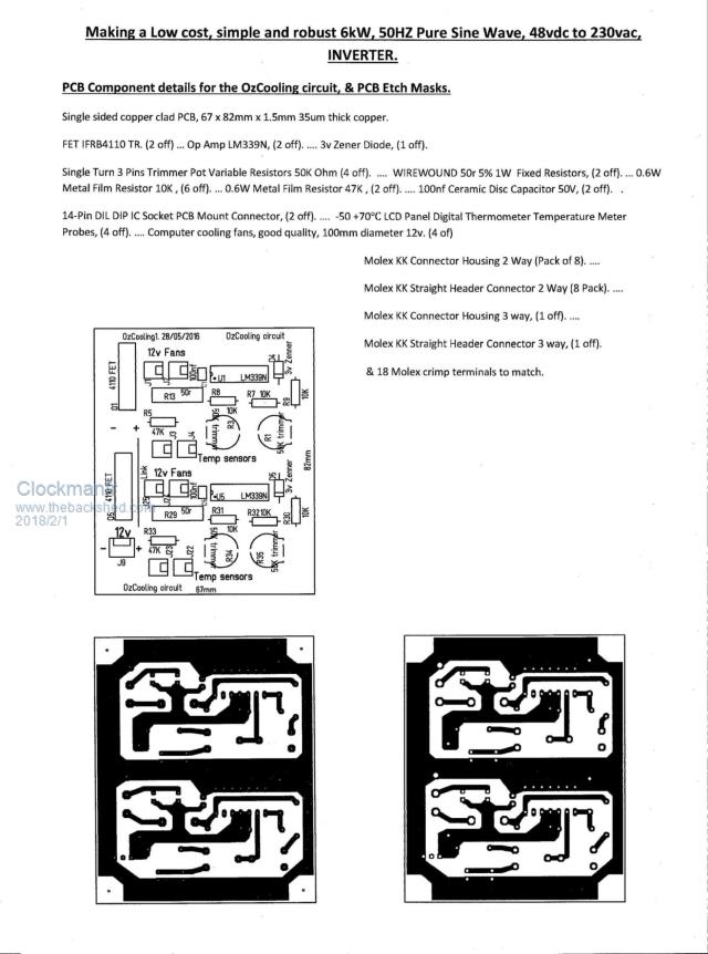 Heres the PDF for the OzCooling board. Its 2 independent circuits with a shared power supply input plug on the PCB, each with 2 temp sensor connections/plugs, and 2 fan connection plugs. Each circuit operates either the PCB cooling or the toroid cooling. I use one fan sucking in/blowing in at the bottom and pushing out the air at the top, which is what natural convection will do, the fans just help things along. I use computer fans, as they can be slowed and speeded up. The two VR's/trimmers/pots per circuit are for sensitivity/ramping and temperature setting/turn on, and then they are gently blowing/sucking dependant on the temp. If the temp keeps rising then the Fans keep speeding up, temp falls the fans slow down. Hopefully you get the picture and can adjust the circuit for your particular situation.. The circuit requires 12vdc sufficient to run 4 fans, so check the wattage of the fans. Its a lovely simple and robust circuit and it operates just sweet. 2018-02-01_062345_OzCoolingMsk+Discrip1a.pdf ![]() HHMM PDF does not seem to work here, here is a image of the PDF ........ ![]() Everything is possible, just give me time. 3 HughP's 3.7m Wind T's (14 years). 5kW PV on 3 Trackers, (10 yrs). 21kW PV AC coupled SH GTI's. OzInverter created Grid. 1300ah 48v. |