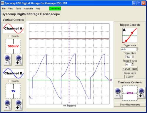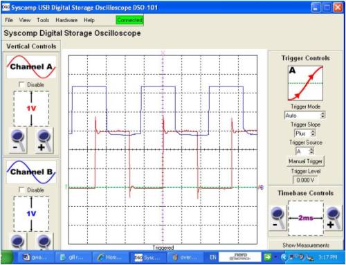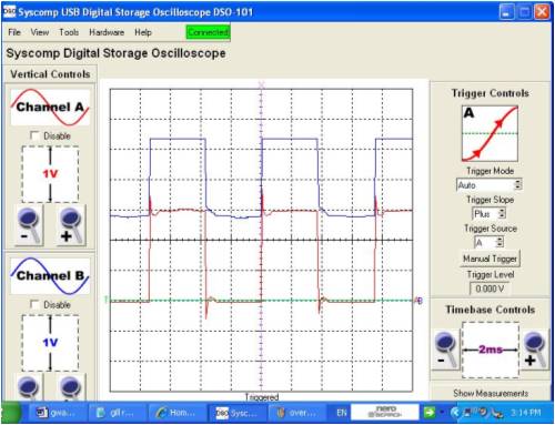 Hi Gill, I will present some DSO readings, [actual measurements, and not an attempt to draw what is thought to happen]. For clarity, in most of the tests, the waveforms are referenced to system [battery & grid inverter] -ve. I present, 1. a single phase, mill side of caps, with the DC voltage present at the upper connection of the voltage doubler as a reference. 2. the DC present on the top of the doubler with the DC present at the joining of the seriesed bridge rectifiers 3. the AC present on the top rectifier, with the DC voltage present at the joining of the seriesed rectifiers as a reference. 4. the AC present on the bottom rectifier, with the DC voltage present at the joining of the seriesed rectifiers as a reference. 5. the DC voltage present at the 24V battery with the DC voltage present at the joining of the seriesed rectifiers as a reference. 6. the between phases voltage just befor cutin. 7. the between phases voltage at an approx 250W power level. The doubler was functioning during all of these measurements. The windmill is a std F&P series 100, wired in delta. The windmill is only AC coupled to the loads. There is no DC path between the mill and the loads. The DSO probes are x10 settings. The ranges I have left shown for clarity. The green line is the zero reference line for both traces. This has been moved down to allow more visible use of the DSO screen. The timebase was free running, and not triggered. pic 1. pic 2. pic 3. pic 4. pic 5. pic 6. pic 7. I have provided the output waveform between phases before cutin as a comparison [pic 6], and that during a mid range power output condition [pic 7]. The capacitors do change the sine wave significantly. The flat topping that normally occurs with a battery loading is not evident. You will also note the strong correlation in voltage between the battery voltage and that present at the joining of the seriesed rectifiers [pic 5]. If there was "shorting", then this could not be. You will notice that the voltage present at the joining of the rectifiers is almost identically half that of the doubler output voltage [pic 2]. There is no bypass capacitance from the seriesed rectifier joining to ground. If there was any "short" that you describe, then this would be evident in the DSO traces. This would be manifested in some AC that would be visible, on the recorded voltages, primarily in the voltage recorded on the seriesed connection between rectifiers. If there is a short that you believe is there, then this somehow results in an increase in power supplied to the loads, with no discernable detrimental effects. You will notice the AC waveforms presented [pic 3, pic 4]. These are square wave in form and close to 50% duty. One waveform indicates power from 0 to half the doubler voltage. The other waveform indicates power from half the doubler voltage to the doubler voltage. These are in phase, so the voltages are additive. I cannot provide much more proof. The theory you present does not seem to be backed up in the measurements I have recorded. This may be due to the square wave nature of the voltage waveform, that reverse biases the diodes, you indicate are providing a short. I welcome anyone else to do the same types of measurements as I have and come to a conclusion that the cct will present a short. PS. I think you will find that a clue as to what is happening is given by the waveforms of pic 3 & pic 4. The voltages on the caps prevent the current from going the wrong way. The currents are steered through other diodes, and do not present a short. I give some more pics af phase/phase rectifier inputs. pic 8. This is one phase again, referenced with the voltage present at the join between the 2 seriesed rectifiers pic 9. This is the voltage traces presented simultanously, on the same phase, on the input to the top and bottom rectifiers. pic 10. This is the voltage traces presented simultanously, on different phases, on the input to the bottom rectifiers. pic 11. This is the voltage traces presented simultanously on different phases, on the inputs to top and other bottom rectifiers. PPS Again I see no evidence of cct shorting behaviour. There is a lower impedance path offered by the bottom rectifiers from the load and back to the AC, to complete the electrical cct. Gordon. become more energy aware |