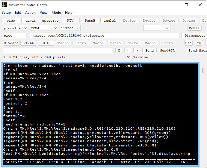 Stan: When you use MMEdit you make changes to your program on the PC then download the entire program into the Pico using a terminal - although you don't see the terminal as a separate program. It's still a terminal as that's the only way to connect to a Pico. When you use the built in editor you first connect using a terminal that you *do* see (usually Tera Term but it doesn't have to be). Anything you type is then sent over the terminal connection immediately, where the Pico acts on it. The Pico, on first connection, is in command line mode. You set stuff up there. Press F4 and you are in the built-in editor. Press F1 from there and you are back in Command line or press F2 to run your program immediately - you don't need to download it first as it's already there. If your program stops for some reason then you are returned to the editor with the cursor on the line where the problem occurred. If you want a big editing screen set Tera Term (terminal settings) to the number of lines and characters that you want. You can also set the font etc. Then use OPTION DISPLAY lines [,chars] to match what you set Tera Term to. I currently use 40 lines of 120 characters. I could easily fill the full screen if I wanted to. All the function keys are labelled across the bottom of the display, so very easy to remember. :) Mick Zilog Inside! nascom.info for Nascom & Gemini Preliminary MMBasic docs & my PCB designs |