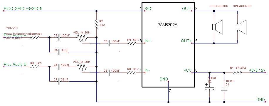 G'day, Using this circuit here for sound effects etc and creates quite a bit of noise. Posting this as hopefully Tom and others may be able to use it as a basis for driving a mono speaker from the Pico. PAM8302A version is differential and Peters MONO function in play sound means almost no noise when idle. Once again component values can be fiddled with to change filter settings and gain: R3+C4 / R5+C7 are low pass filter for PWM carrier supression, change as desired or add LC circuit. C3+VolA / C6+VolB High Pass and AC coupling (C3 / C6 optional but recommended) C5+R4 / C8+R6 are High Pass and AC coupling to PAM Chip R4 / R6 set PAM8302A gain as per data sheet, RTFM Keep the AudioA / AudioB paths the same, differences will cause balance (noise) problems. Will also work with Play tone and Poke &h40050000,&h09 for same frequency both channels or use different frequencies for odd effects, gain will need to be lowered. PAM8302A Datasheet from Element14 is recommended, others are missing an important f in gain calculation. Have a good (long) weekend. Lyle. |