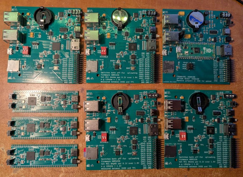 I'm now happy to release the design files for the 2B version of the reference design. This has I2S audio and the rp2350B giving 22 I/O pins on the external header including all 8 ADC pins. The board is fully tested up to and including 1280x720 resolution with DVDD set to 1.3V The overcurrent protection for the USB hub is disabled so it will work with all batches of the CH334F. There is a re-setable fuse on the USB 5V line so this isn't an issue. Schematic 32c6a41b-0058-4b43-a15f-3550061d4cda.pdf Gerbers Gerber_PCB1_2025-03-20.zip BOM and P&P BOM_P&P_2025-03-20.zip EasyEDA design file PicoUSBMotherboardV3.0.zip DXF files for end-plates for the box HDMIUSBV2.0B.zip There are two small changes from my prototypes. First, I'd lost one of the four mounting holes which has now returned. Second, the external I/O header was too close to the HDMI connector so I have removed 2 VCC pins and reduced the header to 30-pins from 32. Note that JLC/LCSC is still out of stock of the APS6404L-3SQR-SN PSRAM chip so you will need to source this separately and install it yourself if required. Also, you can save some cost by buying the various through-hole components yourself and soldering them on the boards supplied by JLC. I do have a surplus of fully loaded and tested RP2350 boards which I would like to sell to anyone in the UK 3 * RP2350B DIL boards @ £20 each 1 * Pico2 reference design @ £25 4 * RP2350B reference design @ 30 - note these are missing one mounting hole and 2 GND pins on the external header are not accessible Drop me a PM if interested. ![]() Edited 2025-03-22 04:11 by matherp |