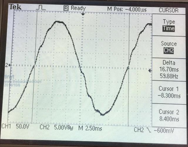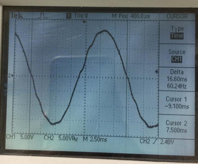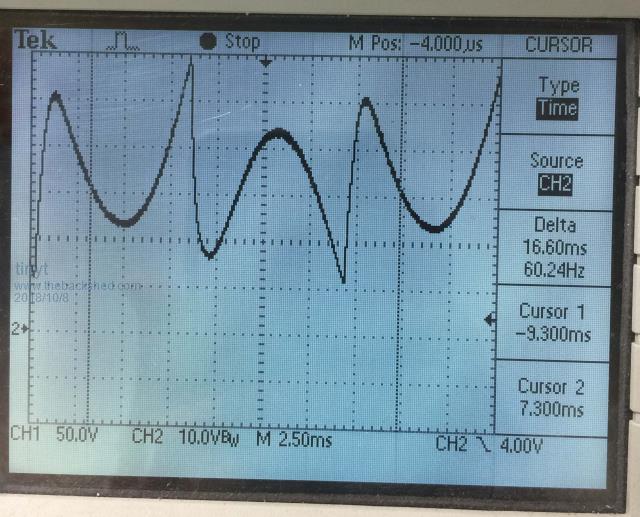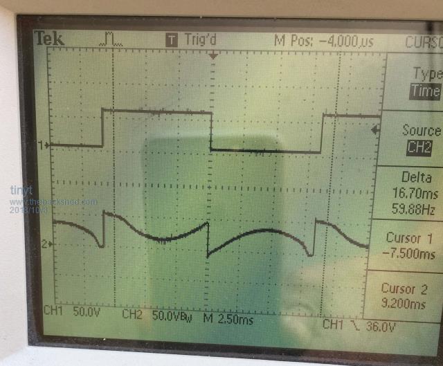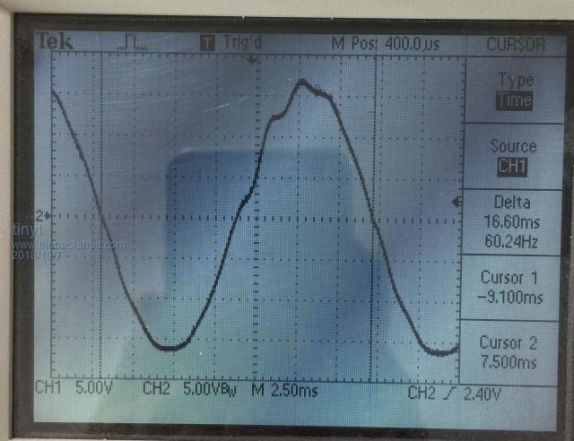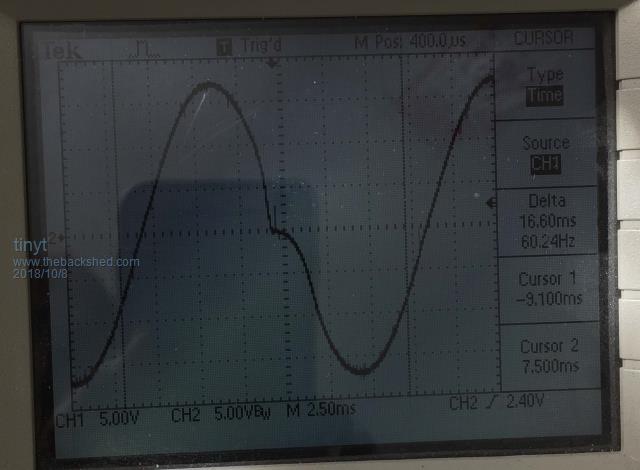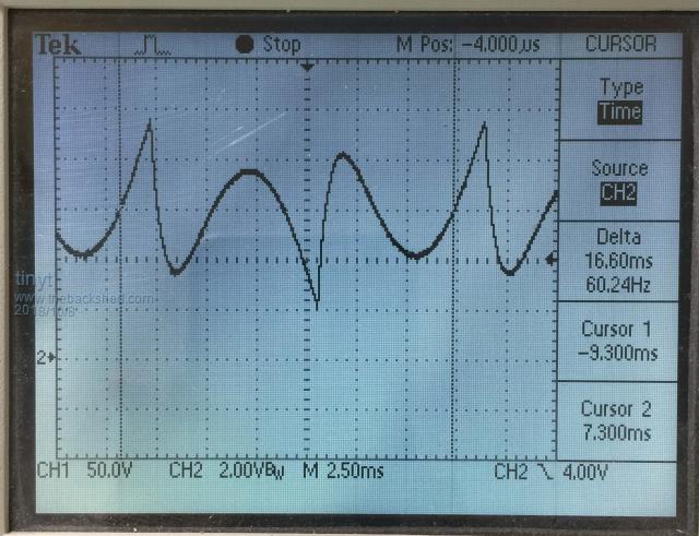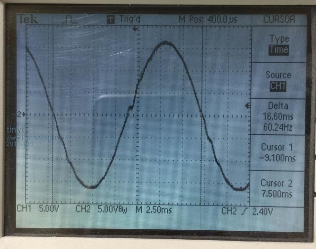 Here is the scope with top trace for the toroid primary connection driven by the 60Hz side of the bridge. The lower trace is the other end of the primary coil driven by the choke. This is with 1.2kw load.