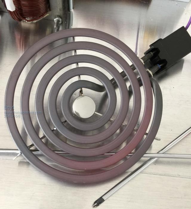 I don't have a 220vac incandescent lamp. But I have a 220vac 1.2kw stove heating element I bought for testing. Here it is powered by the inverter. Could not keep it powered for too long in the house, have to make a better testing setup outside the house.