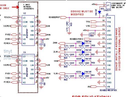 The waveform looks similar. But what I notice is the negative peaks only go to 2V instead of zero. So I checked my schematic. The actual fet drivers are IR2010PBF which are driven by the IR2110S in the EGS002. Pin 8 and 10 of the EGS002 goes up to 12V instead of 5V. Edit: -> (I think my analysis here is wrong) -> So I added voltage dividers. I was thinking that maybe the EGS002 is not pulling to zero the IRF2010PBF due to the voltage divider effect. So I added diodes as shown.