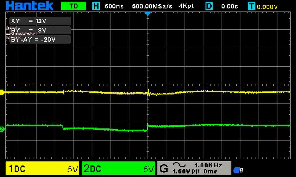 Second scope capture: probe 1 to HO1, probe 2 to HO2. Set scope H to capture 1 to 3 cycles of 20KHz.