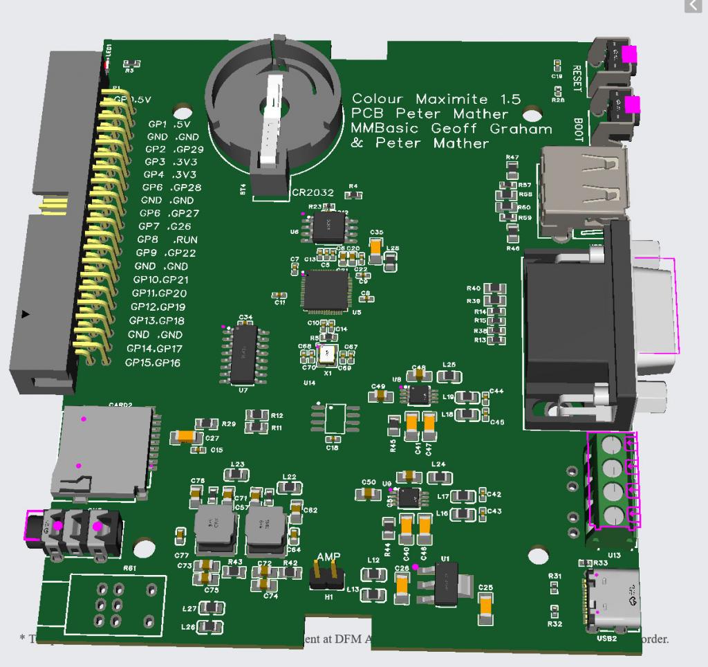 I really like how the PicoMite evolved and now even USB is possible. But there is one crucial thing why I don't like this design (but that's maybe just me!). What is the benefit of the whole Raspberry Pi Pico attempt? It is capable and dirt cheap, you can try things out and do stuff without beeing too careful. If something went wrong with the RP2040 Microcontroller on this board it will be a nightmare to change the IC. At least for a lot of people. In fact, this is the only reason I am still using my own iteration of the non-USB (VGA) version. I am well aware that Peter choose to put the microcontroller right on the PCB, since it frees up some PINS, which are not accessable on the original Rpi Pico board. My idea would be following: just designing a second PCB like the original RPi Pico board with those free PINs / which fits your design needs. This way EVERYONE can just replace the microcontroller board if something went wrong. Problem is, that this whole new design is not that cheap to replace like just the microcontroller board. This is the only thing I would do different. Just as an input ... it is just an idea. I am not trying to suggest that Peter should re-design it, at least not for me, since I am doing my own PCB work. But maybe anyone thinks the same. Who knows :)Greetings Daniel Edited 2024-03-14 04:41 by Amnesie |