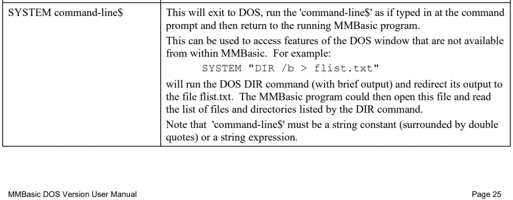 Good day! @matherp I saw here that MMBasic DOS/WIN has a SYSTEM command for performing DOS functions that are not available from MMBasic. ![]() I would like to have the same command for PicoMite MMBasic. Yes, I know that PicoMite does not have a system, but it has a console shell, and maybe someday, some RTOS will appear. In my humble opinion, such a command should already be present in MMBasic for PicoMite. SYSTEM command-line$ This will exit to Shell, run the 'command-line$' as if typed in at the command prompt and then return to the loading MMBasic program. This can be used to access features of the Commamd prompt Shell that are not available from within MMBasic. For example: Option ESCAPE SYSTEM "Files \q*.TXT\q,size" Or perform the system setup OPTIONS offered to the user from the program. Best regards, javavi Edited 2024-12-14 19:22 by javavi |