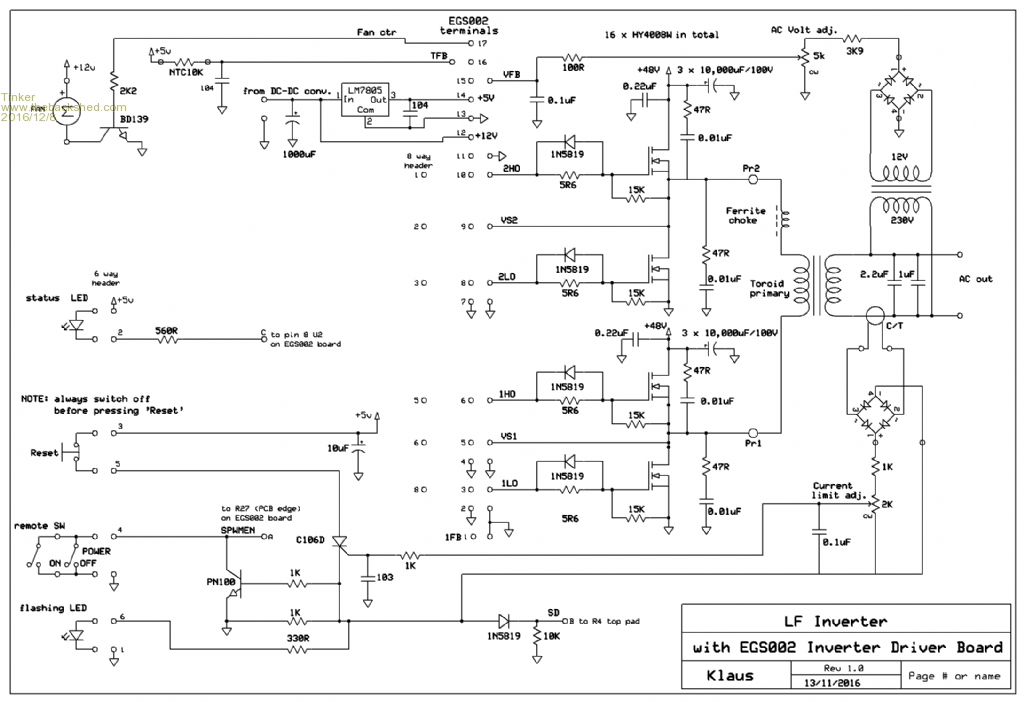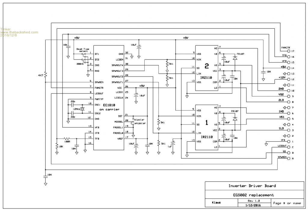 Have assembled the new layout of my EGS002 replacement board and it works! I'm happy now. Its a plug in replacement to my modified 20 pin EGS002 board (see previous page re the mods). But the big plus is the driver IC's can be easily replaced, just plug new ones into their sockets. These chips seem to go kaputt when the Mosfets fail catastrophically. So, here is what it looks like: ![]() The board plugs into my little motherboard where the header pin connectors are located. The 300mm long gate leads from the socket did not appear to affect the running of the inverter. Here is a close up of the replacement board: ![]() And, in case anybody is interested, here are the latest schematics: ![]() ![]() Please note that the schematics I had posted previously have changed. I have to post updated ones as there is no way to correct what I posted some time ago. Oztules, you might be interested in the current shut off testing I did today - it works very well. I connected a 600W load to my test rig and slowly increased the current sense potentiometer until the SCR tripped. Unit shut down and flashing LED came on as expected. Reduced the current sense pot a little and, after resetting, switched on again. No start, the pot required more adjustment. When I found the setting where it reliably started with the above load every time I left the pot alone. Then I switched on an additional 100W load and the inverter shut down instantly, no hesitating at all. I could repeat that successfully many times. I did not try the short circuit test, not game enough yet but I think it might work too as the overload shut down is very fast.Klaus |