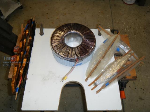 Confused you, I'm good at that I unwound the three in hand (outer 250V winding) as one and then laid all three along the ground and unravelled them that way. Using three shuttles at once would be a real challenge, congratulations for mastering that feat. You need not count anything by way of turns when unwinding. That is why you wound a ten turn test winding around the thing while it was still whole. The voltage from these ten turns gives you the volt per turn ratio. From that you can calculate how many turns your original winding had. Provided, of course, you took precise measurements with the 10 turn and original winding mains voltage. If your core measures 203mm OD, 100mm ID and 70mm high you could use my suggested numbers (225 turns of 3 x 1.8mm)secondary, 25 turns primary. While warpspeeds comments are true with the toroid, you should try to wind as tight as possible to avoid vibrations in the turns. That is also why we epoxy each layer and wrap that clear tape back on. You will never get the new windings back on as tight as the original machine wound ones were. With my original 195 turns and added 30 the hole had shrunk 75mm. I put that electrostatic tape back on which shrunk it a bit more. After my rectangular enamelled primary winding was on the hole had shrunk to 55 mm. You will get a lot less than that using round bundled wire. Just leave enough for the 12mm mounting bolt. Calculate the space required for your primary wire bundle first, before you put that static tape back on. If it looks very tight with space leave the static tape off and gain a few mm that way. This tape prevents static coupled primary to secondary interference. Klaus |