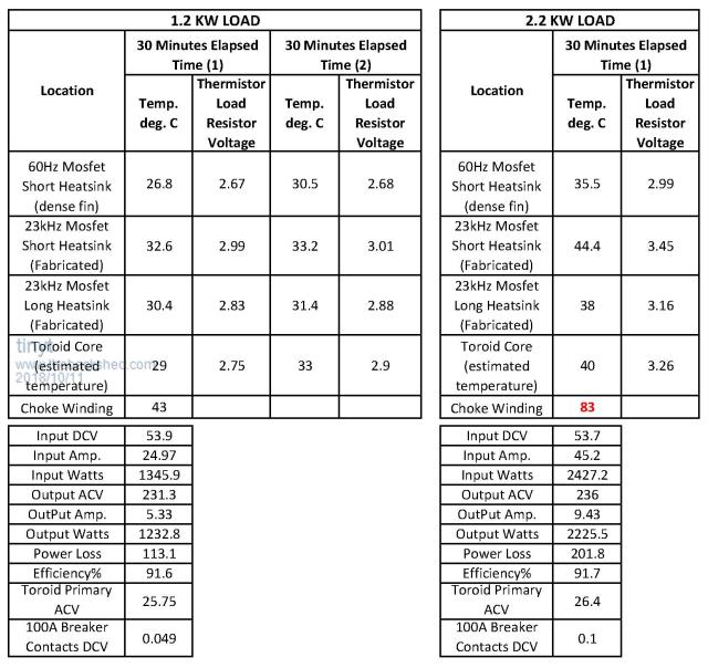 Some Load testing data: temperature readings, etc. I was able to do up to 1 hour with the 1.2kw load. But for 2.2 kw, I stopped after 30 minutes as the choke winding temperature rose too high for me. I was afraid that its winding epoxy will soften.