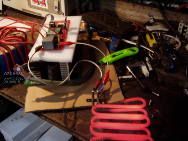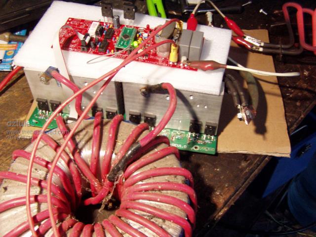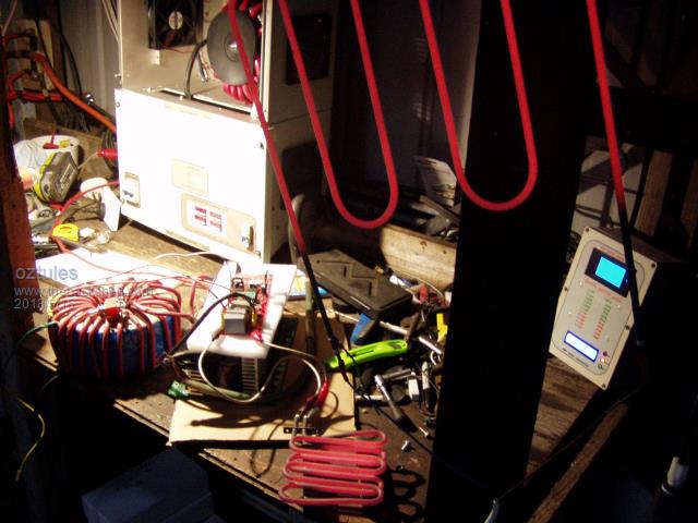 Ok, got home at 4.30, and decided to run the boards from last night. Dusted off the old single tranny, and we got this: Unit sounded happy too. close up just because I like it.... Now we put some more load on.... stop and start under load... no problems either.. This is just a pic to show the setup. Here we are with 4-5kw.... still no problems, in fact inverter near silent now. Both elements running So it is a nice unit, and have no drama's. It stops and starts under 5kw of load, just seems very stable. all good. ..........oztules Village idiot...or... just another hack out of his depth |