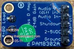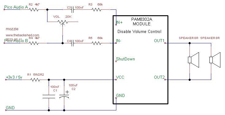 G'day, Perhaps a noisy cricket might be suitable for fitment into the Tomboy, you get noise and haptic feedback in one package (6 legs) and less headaches than a small boy + trumpet... Tom mentioned he fed the PWM from the Picomite straight into the PAM amp, this just expands on that idea... Cutting the track (yes the blue one) disables the on board volume control and allows us to set the gain for the PAM8302 using external resistors (R3/R5), if we do this and bring the gain down so that the amp is still high frequency modulating the lower frequency PWM from the Picomite we don't need a filter, the speaker will do it for us. If we now use the external volume control to adjust the amplitude of the PWM going into the PAM amp, it will adjust its modulation to suit, and we have audio from the speaker with very few external components, possibly the lowest realistic component count, even C3 and C4 are optional due to the 1uF caps on the PAM module. This works surprisingly well here with my setup, not hifi but it could be ok for the Tomboy application. I still recommend the earlier circuit with filters etc and stereo volume control as a better solution. The idea of putting the audio circuit on a sub-board is a good one, allows tinkering with the design, then the "fun" can continue even after the main board design has been finalized... Can I suggest once again if you haven't already tried and you have a spare analog input, wire the volume control to it and do the volume control in software, then the circuit is possibly R1 + C1 + C2 + R3 + R5 and thats it... Regards, Lyle. |