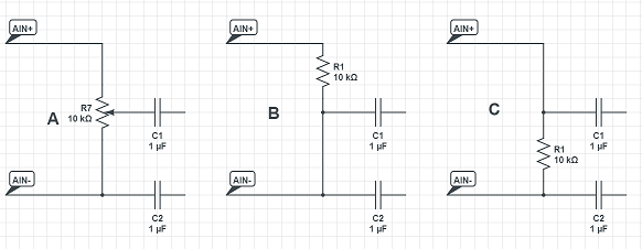 Hi Tom, What Mozzie said. First you need to understand that the amplifier is a DIFFERENTIAL amplifier. It amplifies the difference between the two inputs. The two 68k resistors are a necessary part of the circuit and define the gain. ![]() Without them, the on board 100 ohm resistors are setting the gain, so it will be very high and you will be over driving the amp so it will be just feeding the speaker with a digital ON/OFF signal which the speakers are effectively 'filtering' because they can only produce a range of frequencies. The two filtered PWM outputs should be equal and opposite. With the 68k resistors in circuit and with a pot connected between the IN+ and - inputs consider when the pot is set at zero resistance. The DIFFERENCE between the + and - input is zero so the output is zero or there about depending on the matching of the components. When the pot is at maximum, the DIFFERENCE between the + and - inputs will be at the maximum and so will the volume or gain. In one of your circuit's configurations you are actually connecting two Pico outputs together via capacitors. That may produce some high current spikes in the outputs and damage the micro. I hope that clears it a little Bill Keep safe. Live long and prosper. |
