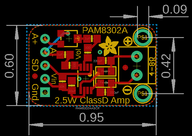 I think the blue track: ![]() I'm not certain but I think it's possible @Mozzie's latest proposal also included removing the low pass filter ... perhaps an omission, or perhaps relying on the capacitors and ferrite beads on back-end of the module and the speaker itself to do a good enough job (?) In any case I have committed the earlier PAM8302 design to protoboard for the Mk2 now. Ack, it was an accidental omission, and also omitted on my breadboard - which wasn't ticking - it may well be in my head - I'll worry about it later if it's still there once the whole prototype is built. OK, I will take a look. Best wishes, Tom MMBasic for Linux, Game*Mite, CMM2 Welcome Tape, Creaky old text adventures |