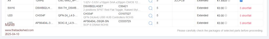 SW16 is just a simple through hole DIL 2 position switch that you can get from anywhere. The CH334F appears to have been withdrawn following my complaints about quality issues with current batch. The memory chip has never been available from JLC/LCSC and should be sourced separately e.g. . I have just done a design with a different hub chip and am waiting for the boards to be built and shipped (c2 weeks). I've also replaced the switch with one that is in-stock. Once proven I will release the gerbers for this slight modification. Edited 2025-04-10 20:48 by matherp |