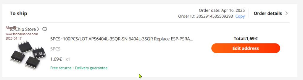 My boards are still in production at JLCPCB (89% production progress). I have now ordered 5 PSRAM from AliExpress and am surprised that I only pay €1.69 including shipping. How do they do that? |