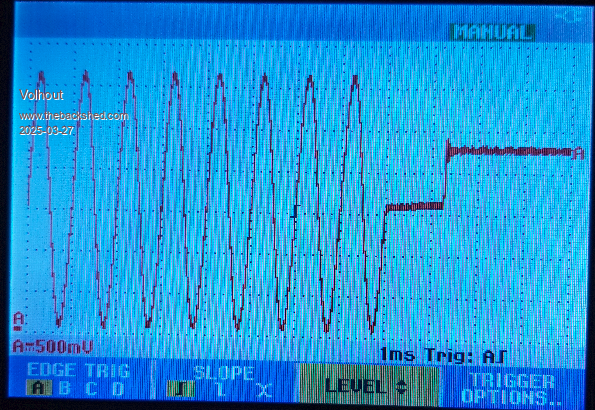 Hi Peter, When I PLAY TONE 400,400 and stop it with PLAY STOP, I get nice 50:50. Confirmed. Observations: When I PLAY WAV "xx" and the tune ends, I am at 50:50. Confirmed. Play stop always returns to 50:50. When I PLAY TONE x,x,y and the tone ends after y ms, it ends at 2.3V (69% PWM). tested several frequencies, all end at the same level. Several different times. Always the same 2.3V. So there is no relation between frequency and time for the level 2.3V. When I PLAY WAV, then PLAY PAUSE, I get 2.3V. The same 2.3V. Even if I started with a power cycled unit that has 50:50 at start of the play wav. This is VGA design 2 RP2040. Another observation: after power on (without anything playing) the initial value is 50mV lower than the 1.65V (1.60V), as if the default PWM is set to 48.5%. This is a minute difference, and may even have a different cause. (i.e. changing drive strength of the IO pins) So ignore this for now, but it may give a lead into the other issue. So in summary: when PLAY TONE ends by the set time, and with PLAY PAUSE this happens. PLAY STOP does not. Volhout P.S. I have never seen your 41%. It is always 69%. Maybe it is taken from some not-initialized memory location ? Edited 2025-03-27 17:24 by Volhout PicomiteVGA PETSCII ROBOTS |